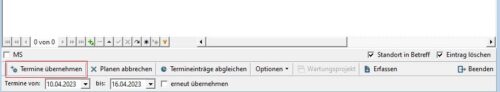Klickt man danach auf „Termineinträge abgleichen“, werden diese sofort in den Terminplaner übernommen und können dort analog den Störungen abgearbeitet werden.