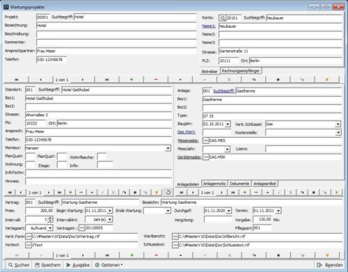 Es werden die Wartungsprojekte mit den Standorten, den Anlagen und den Verträgen angelegt und verwaltet. Zu jedem Wartungsprojekt können mehrere Standorte und zu jedem Standort mehrere Anlagen angelegt werden, zu diesen sind wiederum mehrere Verträge möglich.