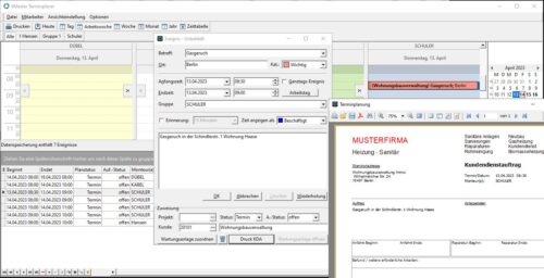 Mit einem Doppelklick in einen Kalendertag öffnet sich das Ereignisfeld, hier können alle relevanten Daten zur Störung aufgenommen und einem Kunden zugeordnet werden. Anschließend kann sofort der Kundendienstauftrag per Mail an den Monteur geschickt werden.