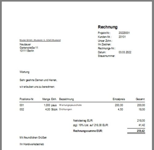 Nach der Reparatur erfolgt mittels des ausgefüllten Kundendienstauftrages die Rechnungslegung im Handwerksprogramm.