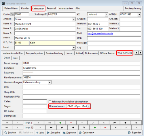 Anschließend richten Sie in der Lieferantenverwaltung unter Web-Services die Open-Masterdata-Schnittstelle zu Ihrem Lieferanten ein.